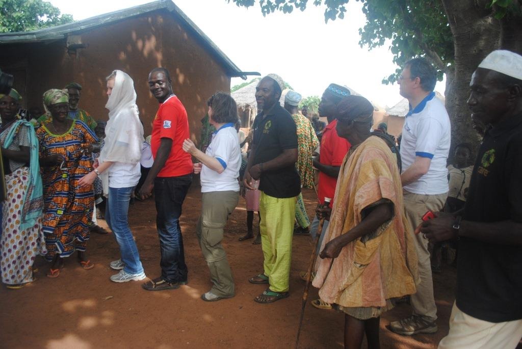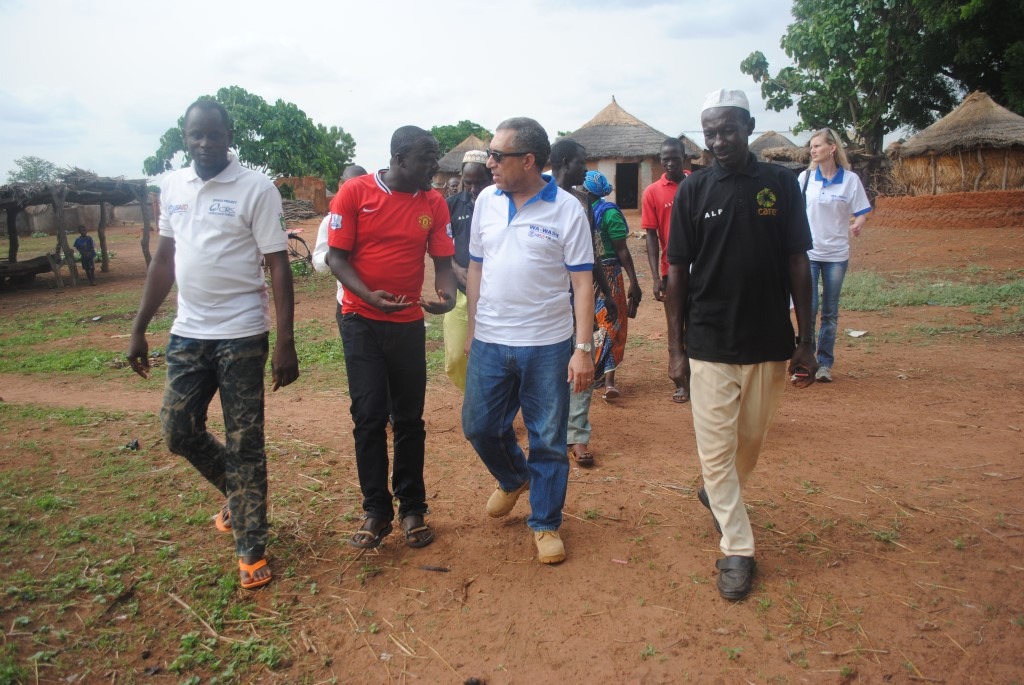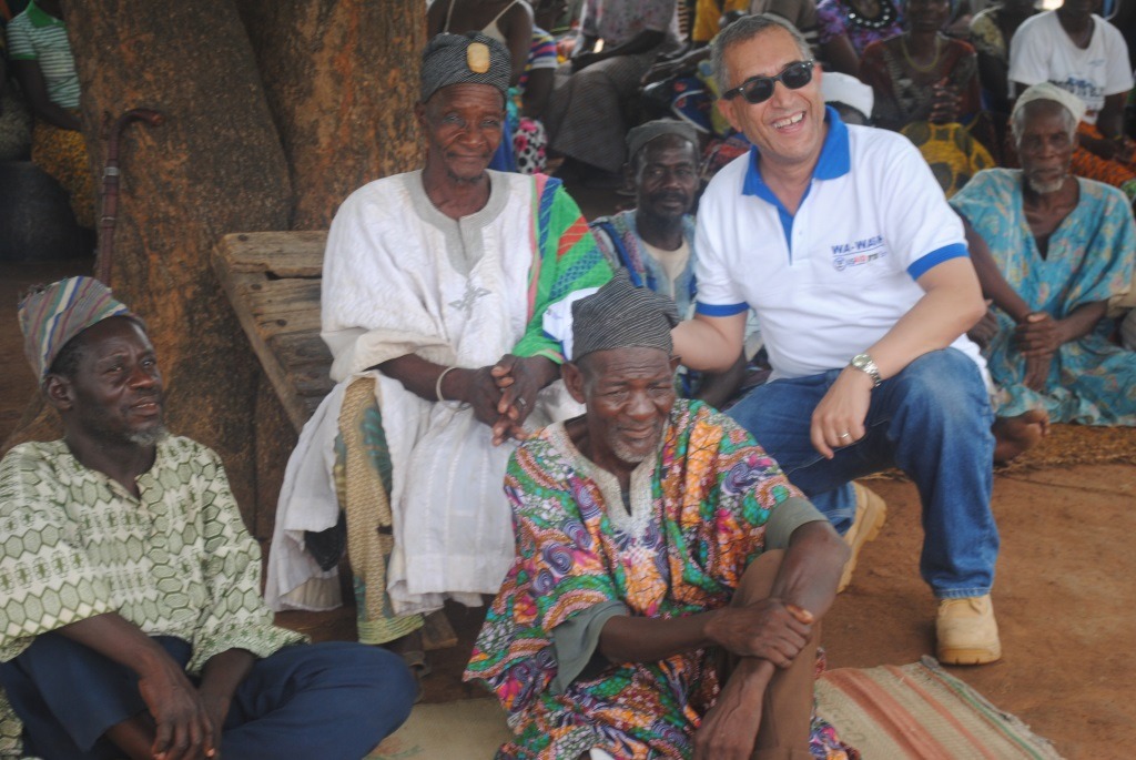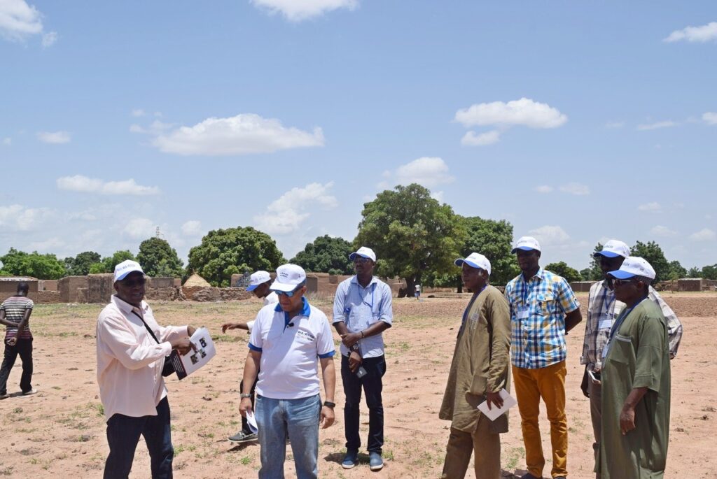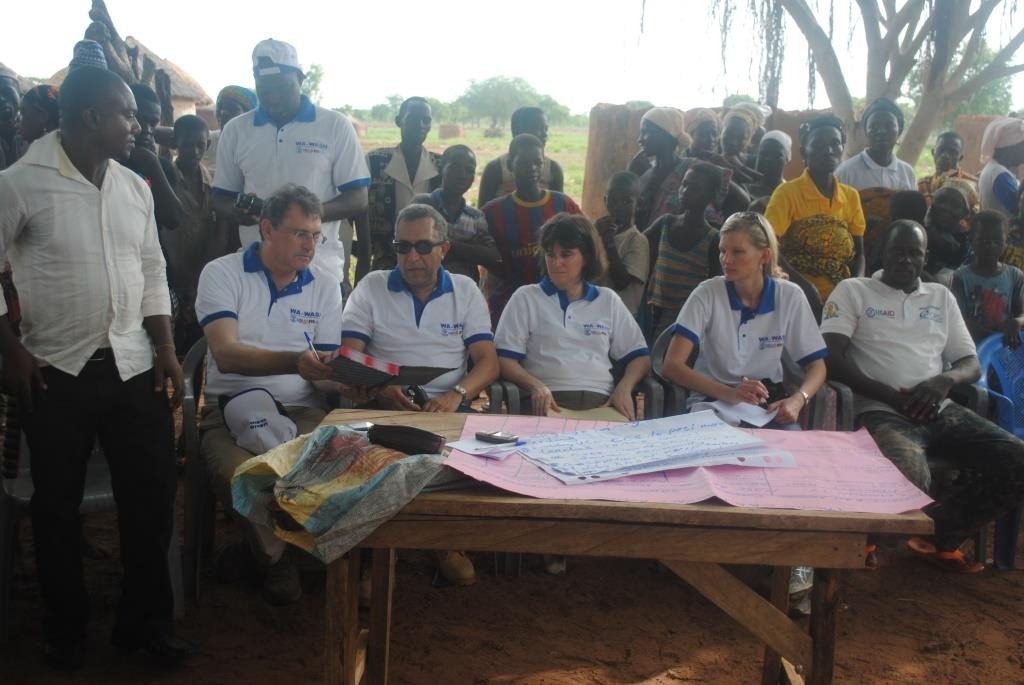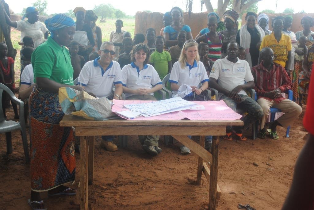 Dr. Boukerrou and members of USAID West Africa Regional Office holding a community gathering under the mango tree to discuss "Water, Sanitation, and Hygiene Challenges and Solutions in Rural Burkina Faso"
