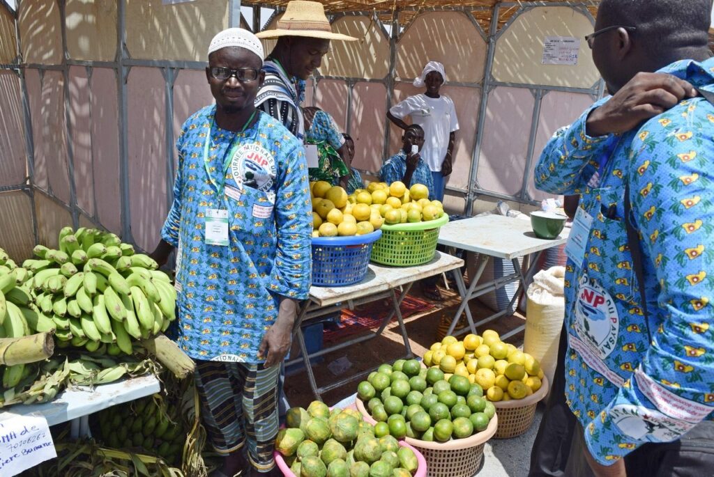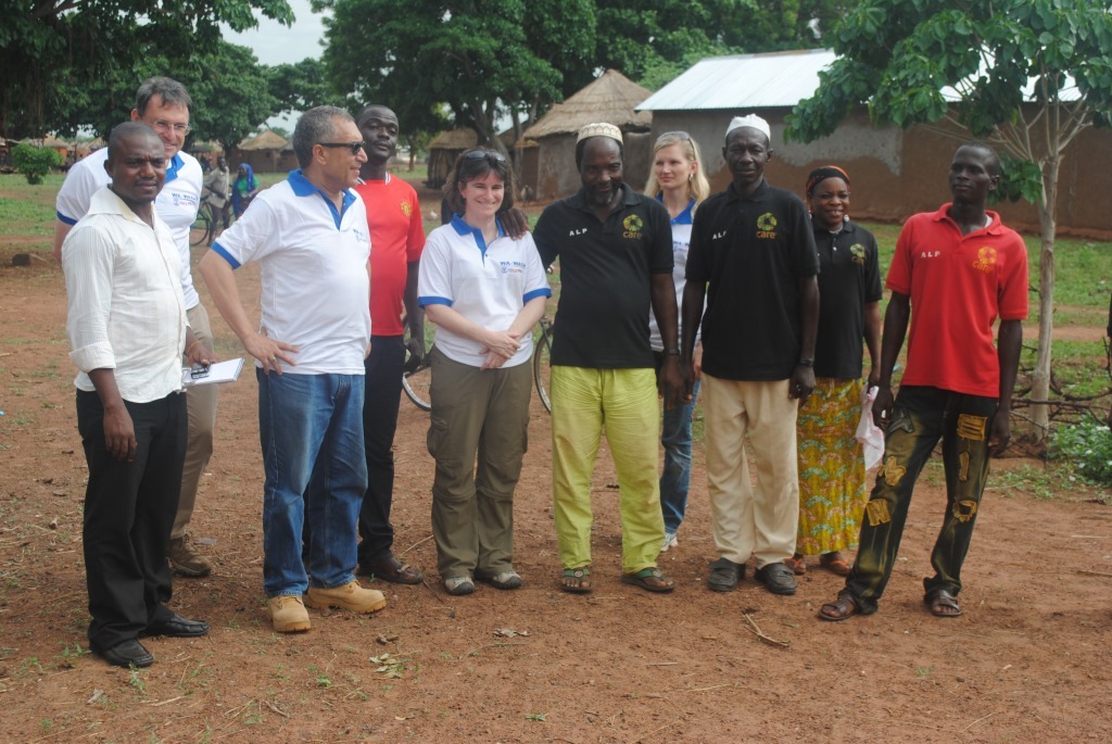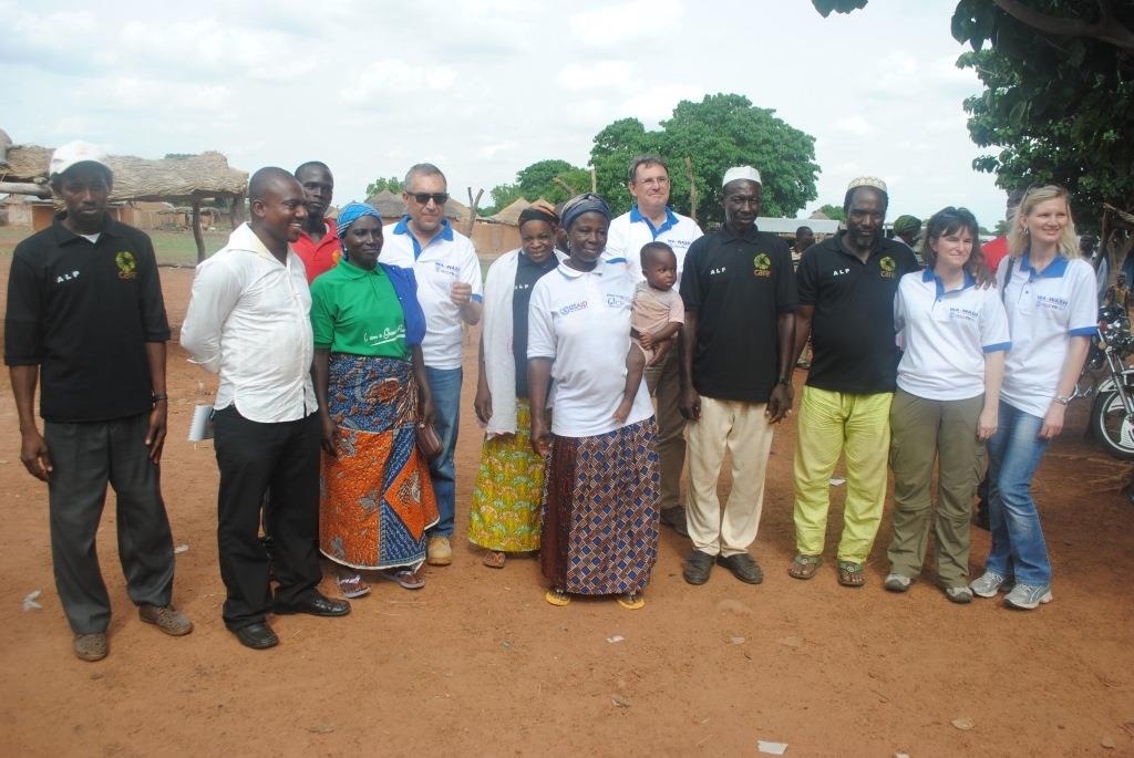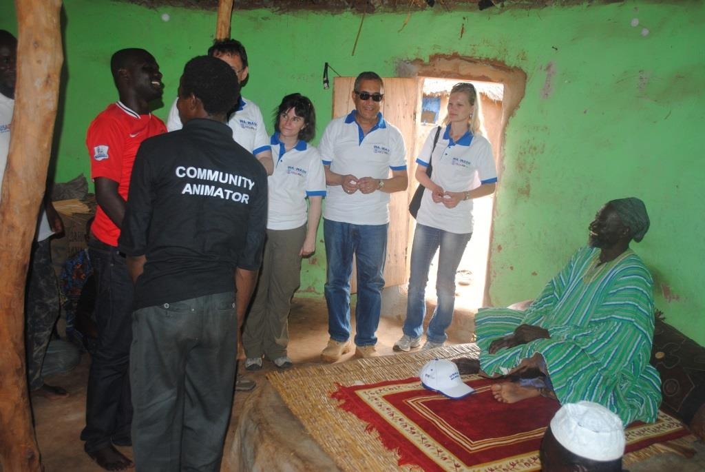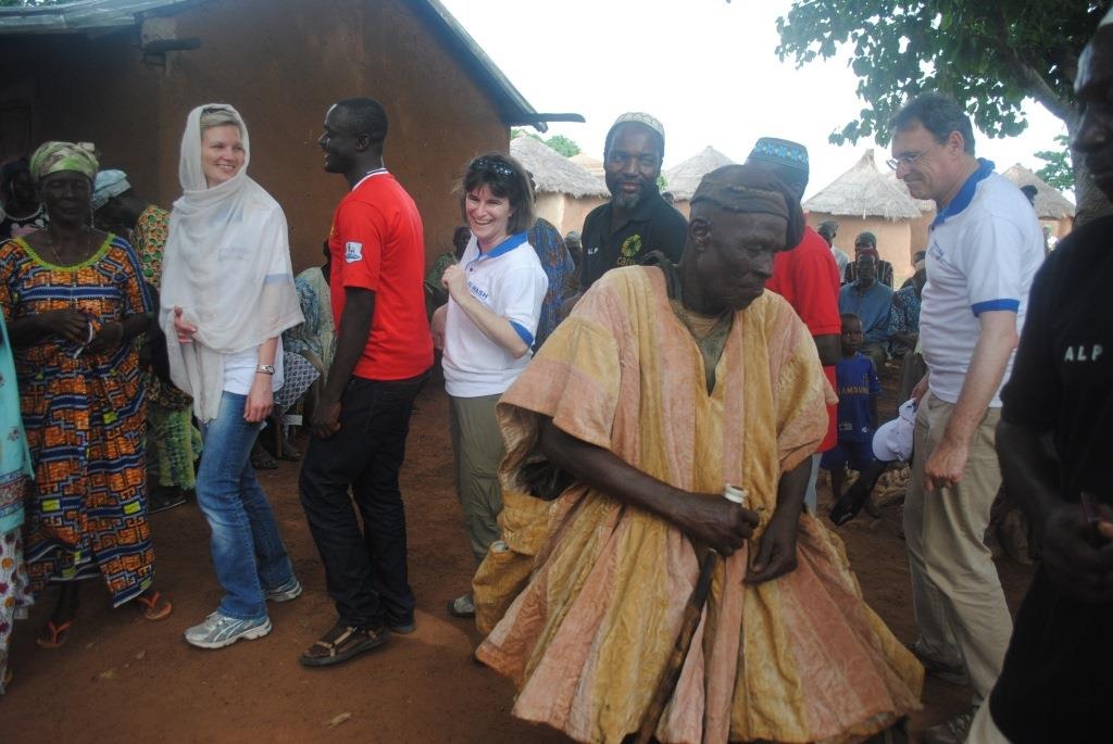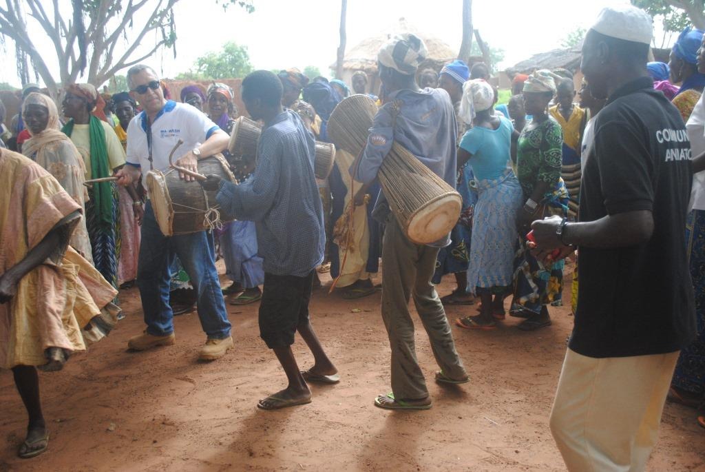 Dr. Boukerrou and members of USAID West Africa Regional Office holding a community gathering under the mango tree to discuss "Water, Sanitation, and Hygiene Challenges and Solutions in Rural Burkina Faso"