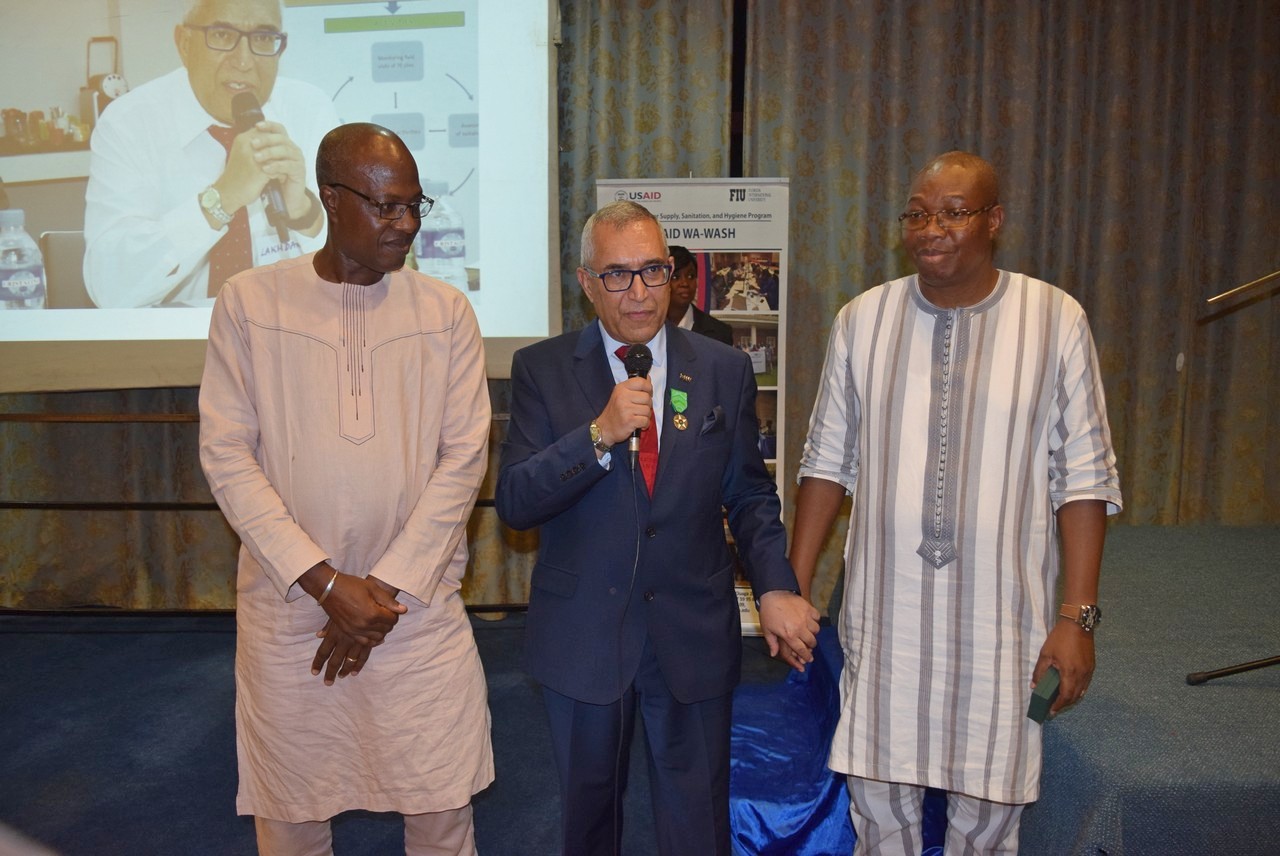 For its six years of contribution to improving the livelihood of the people of Burkina Faso, the FIU USAID WA-WASH Project manager by Dr. Boukerrou has been recognized as a Knight of the Rural Development Merit Order by The Grand Chancery Order of the Office of the President of Burkina Faso. This is a significant recognition of the efforts of the Ouagadougou regional program team lead by Dr. Boukerrou to address water, sanitation, hygiene, food security, climate change as well as gender equity in three major West African countries (Burkina Faso, Ghana, and Niger). The last two years of the program focused on institutional and human capacity building and the sustainability of the program investments of the previous four years.